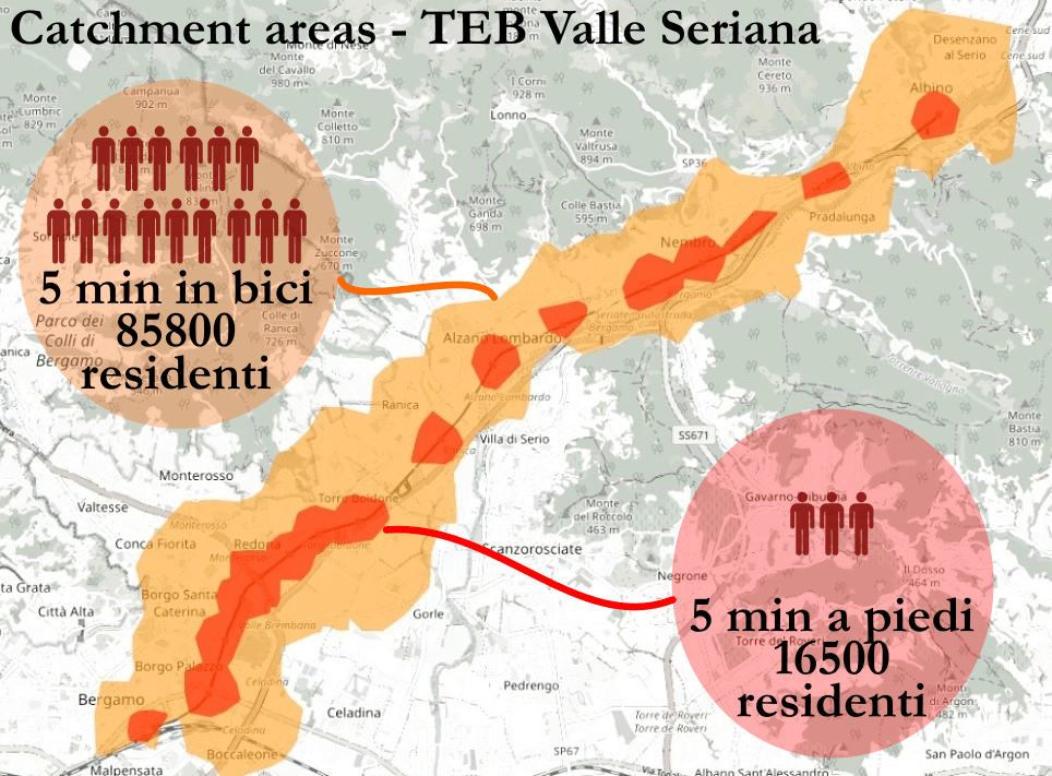 Abbiamo fatto un esperimento per testare il potenziale della bicicletta e dell’intermodalità in Valle Seriana e a Bergamo analizzando i bacini di utenza delle fermate TEB da Bergamo ad Albino, confrontando il numero di persone residenti nel raggio di 5 min a piedi e di 5 min in bici da ogni stazione (5 minuti rappresentano per noi la soglia mentale entro la quale si percepisce di avere “una fermata del tram sotto casa”).