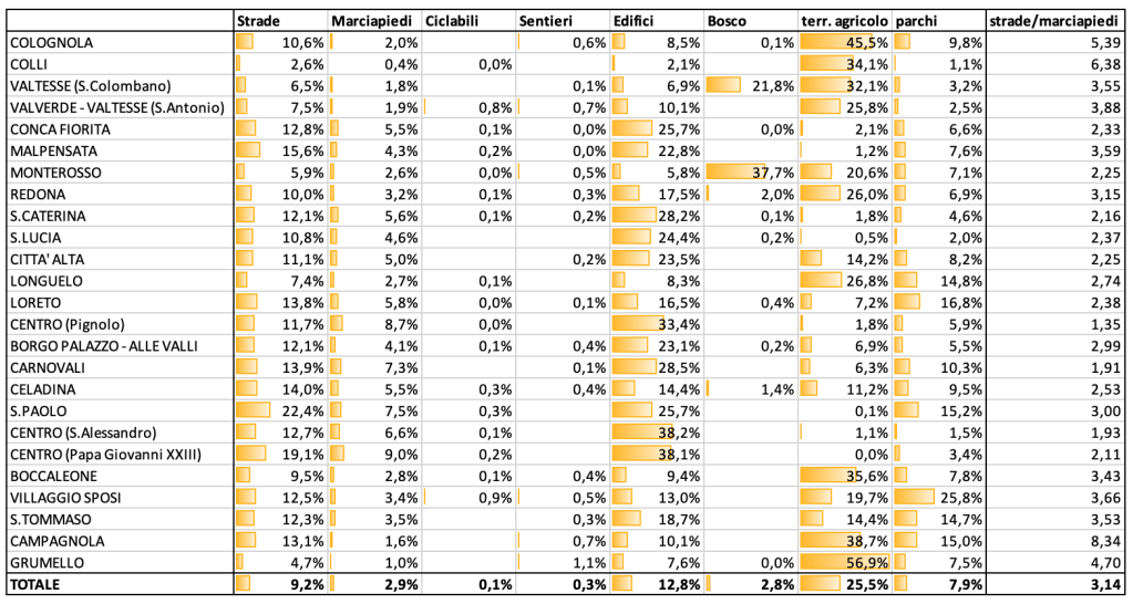 Nella tabella qui sotto mostriamo per ogni quartiere la percentuale di spazio dedicata ad ogni destinazione, calcolata a partire dai dati grezzi. Vediamo come più del 9% dello spazio è dedicato alle strade e ai parcheggi a raso, cifra che supera lo spazio dedicato ai parchi pubblici (7,9%). Lo spazio dedicato ai pedoni è pari al 2,9%, mentre le ciclabili rappresentano solo lo 0,1% del territorio. I quartieri del centro, essendo i più urbanizzati, mostrano le percentuali maggiori di strade rispetto all’area totale, ma anche altri quartieri come Malpensata, Celadina e Carnovali mostrano un tasso molto alto di asfalto, a causa della presenza delle grandi direttrici e di ampie zone di parcheggio. Guardando al rapporto fra i diversi usi, notiamo come in media lo spazio dedicato alle auto sia più di 3 volte maggiore rispetto allo spazio per i pedoni, con molta variabilità tra quartieri; ad esempio in “CENTRO (Pignolo)” si ha un rapporto quasi paritario, mentre a Campagnola lo spazio per le auto è più di 8 volte quello per i pedoni. Lo spazio per le biciclette è poi quasi inesistente dato che le ciclo-pedonali e le bike lanes sono “assorbite” in queste statistiche da “marciapiedi” e “strade”, rispettivamente (con tutti i problemi legati al conflitto con altri utenti della strada).