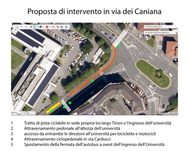 Il progetto non richiederebbe interventi particolarmente costosi e invasivi, e l’ampiezza della strada in via dei Caniana permetterebbe secondo le nostre stime di rispettare i severi criteri imposti dal codice della strada per la creazione di una ciclabile in sede propria bidirezionale. Nella primavera del 2021, l’Università di Bergamo sarà sede di un’importante conferenza sulla mobilità sostenibile nelle università, organizzata all’interno del progetto U-MOB LIFE, e sarebbe bello accogliere la conferenza in un ateneo veramente a misura di bicicletta, sia all’interno dei campus, sia nelle loro vicinanze.